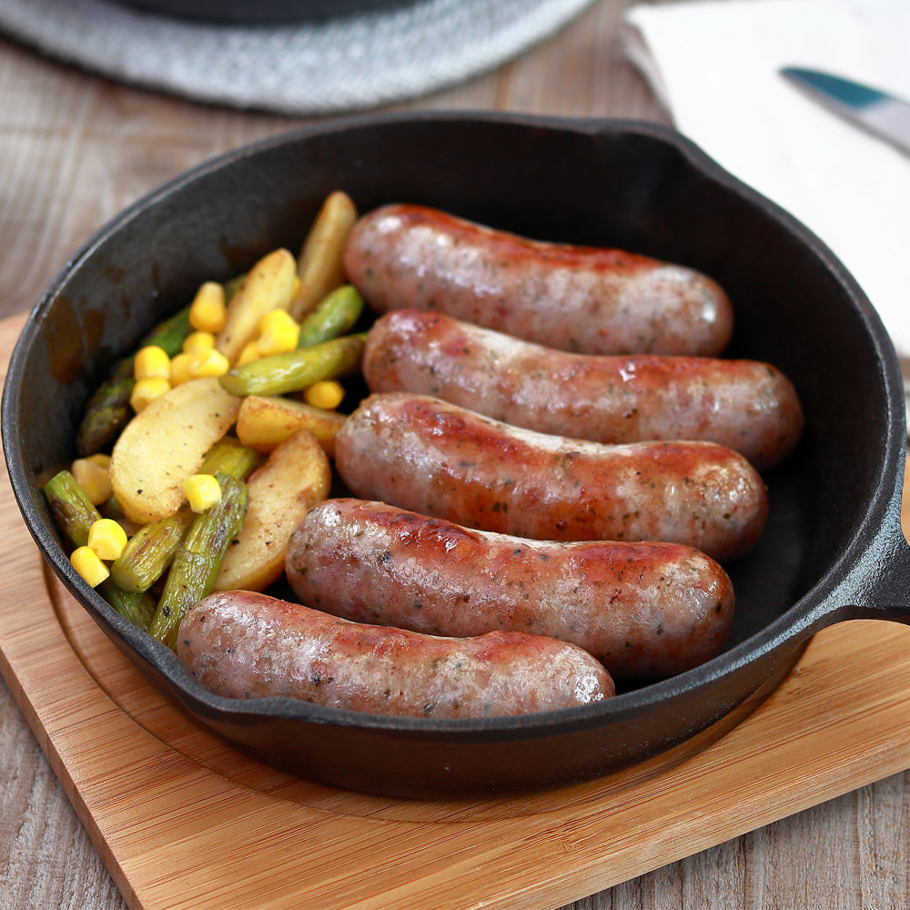 元気豚の粗挽き肉に、ローズマリー、バジル、セージ、タイム、フェンネル、オレガノ等のミックスハーブと黒胡椒を使用し、香り高く少しスパイシーに仕上げたこだわりのフランクフルトです。ハーブの香りを生かすため、スモークはせずに仕上げました。