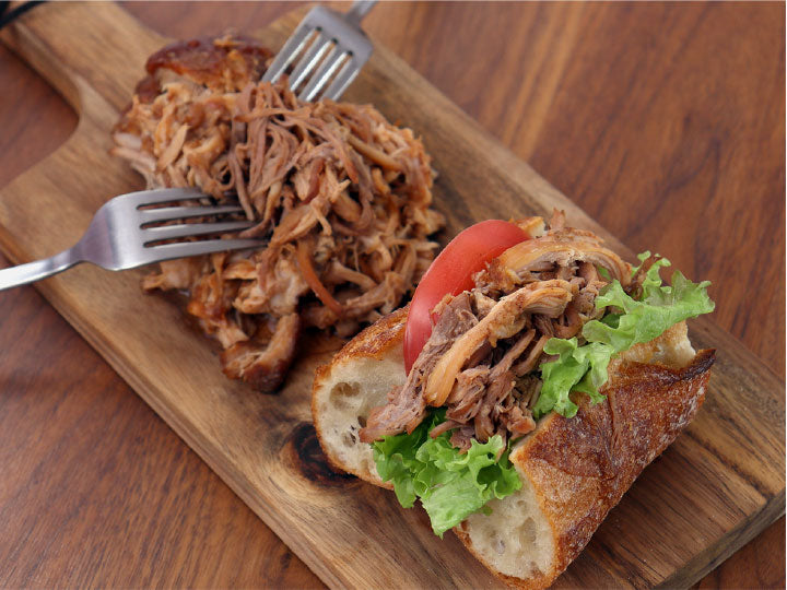 食べやすいケチャップ系バーベキュー味。ほぐしてハンバーガーやサンドイッチなどにどうぞ。