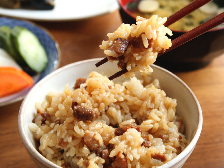香ばしく炙った焼豚がごろごろと入った混ぜご飯の素。炊きあがったご飯に混ぜるだけなので簡単!