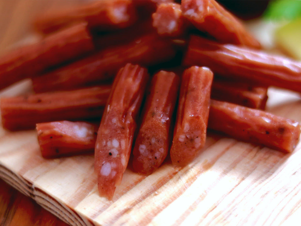 サラミは、旨味と風味をしっかりと味わっていただくため、じっくりと時間をかけてお肉を熟成させ、添加物による味付けを最低限に抑えて作りました。