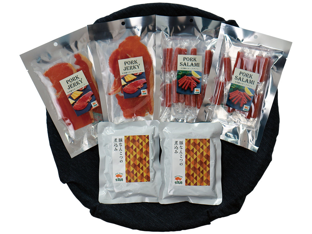 元気豚100%使用!お酒のおつまみにピッタリな豚なんこつ煮込み、ポークジャーキー、サラミの3点をセットにしたおつまみセットです。