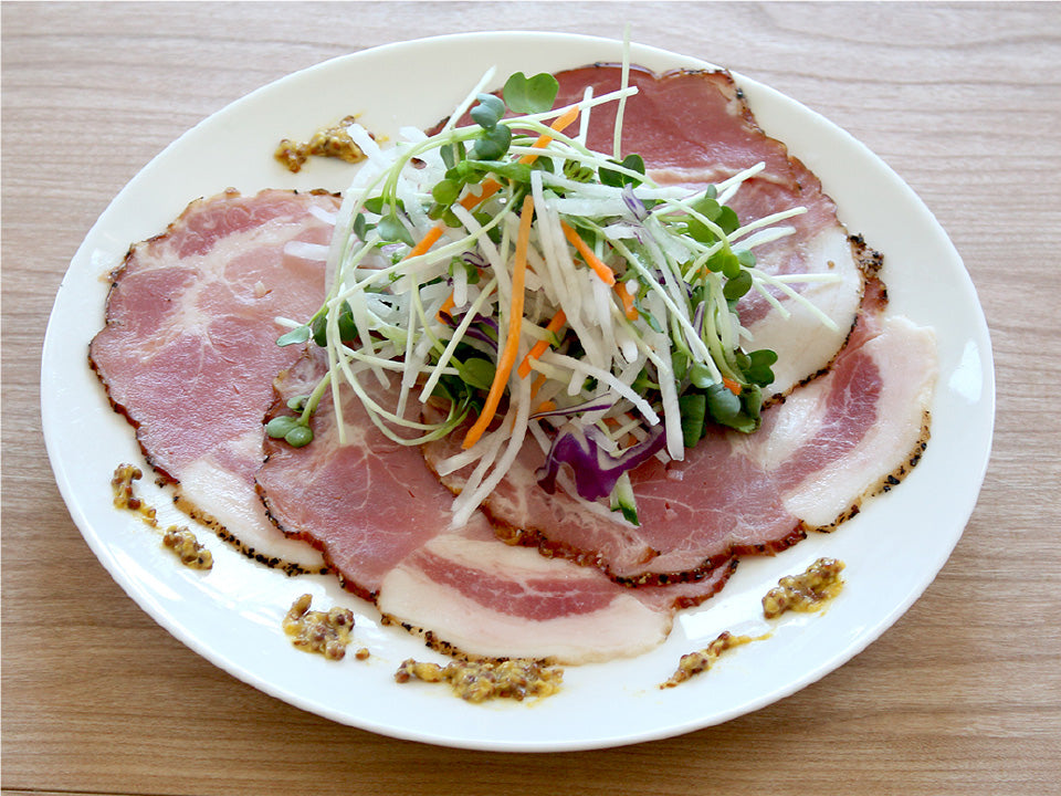 表面に黒胡椒をたっぷりとまぶした、スパイシーで風味豊かなドイツ風ハムです。